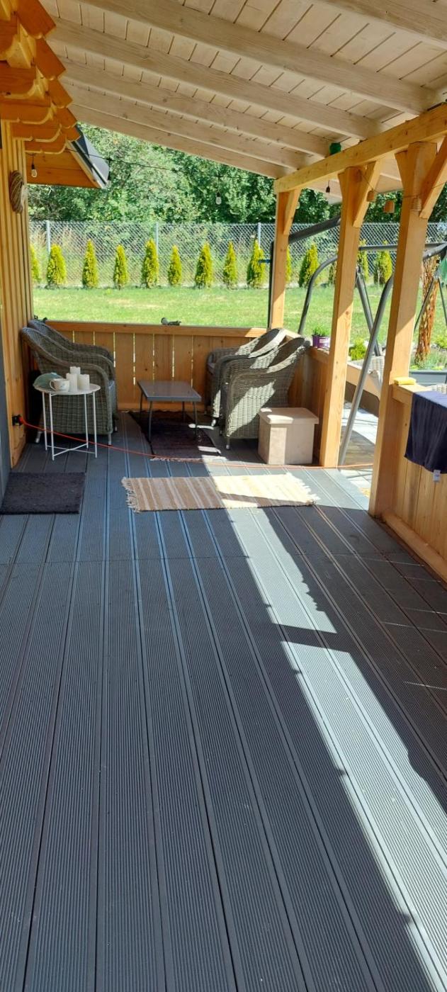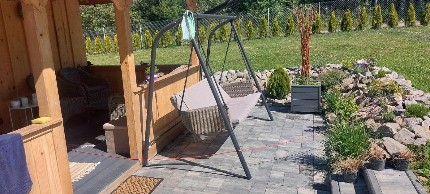 Domek. This chalet comes with 1 living room, 2 separate bedrooms and 1 bathroom with a shower and free toiletries. Guests will find a stovetop, a refrigerator, kitchenware and a microwave in the fully equipped kitchenette. The chalet also includes a barbecue. Boasting a terrace with garden views, this chalet also features a dining area and a flat-screen TV. The unit has 4 beds. Domek - 5 osobowy. Powierzchnia pokoju ok.: 35 mkw.